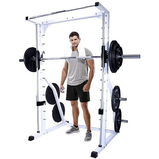 Pro Smith Cage Workout Machine Full Body Training Home Gym System with Leg Developer, Press Bar, Cable Crossovers and Squat Rack, White